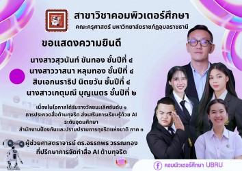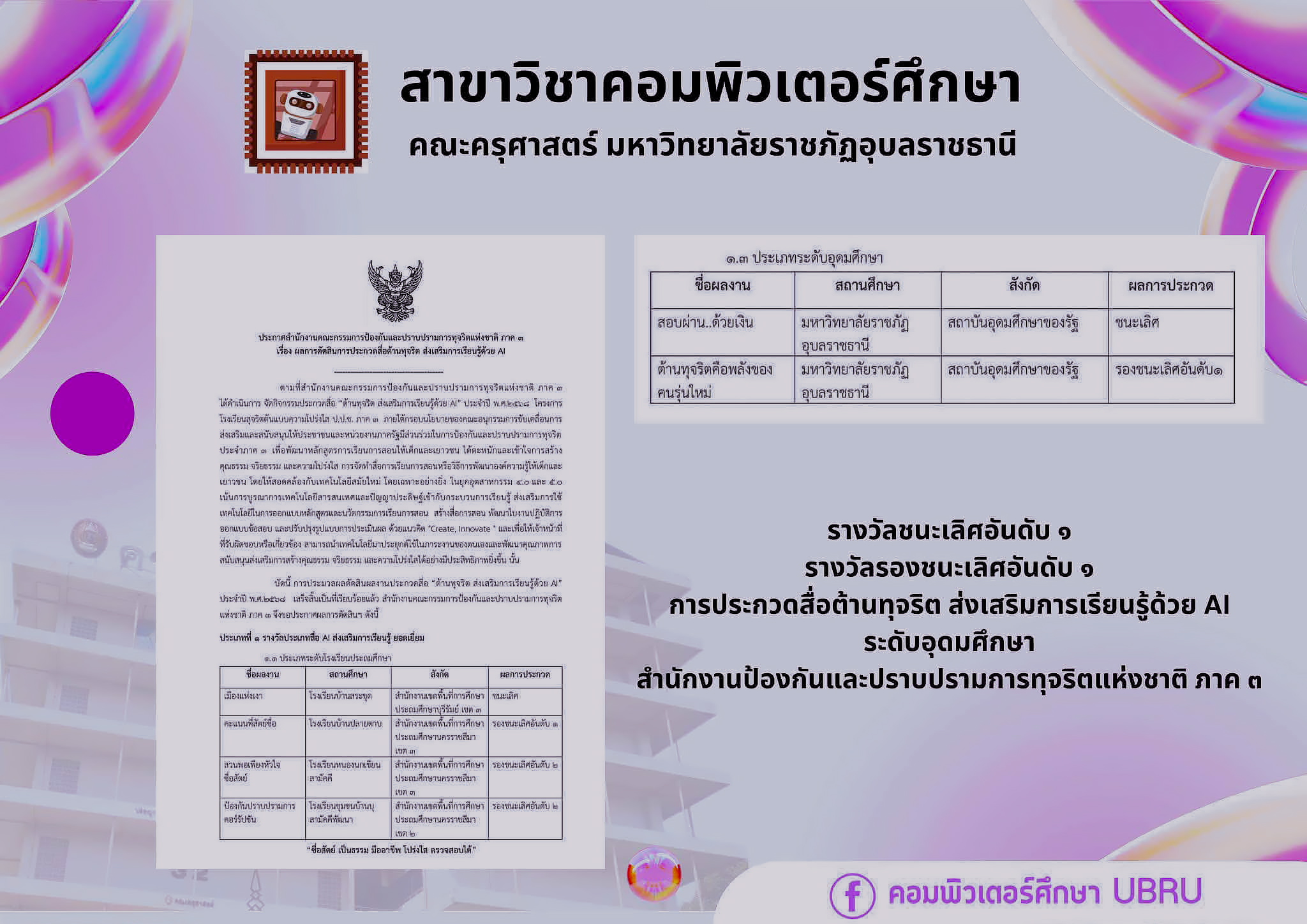 นักศึกษาจาก สาขาวิชาคอมพิวเตอร์ศึกษา คณะครุศาสตร์ มหาวิทยาลัยราชภัฏอุบลราชธานี สร้างความภาคภูมิใจให้กับมหาวิทยาลัย ด้วยการได้รับรางวัลสำคัญ ได้แก่ รางวัลชนะเลิศ และ รางวัลรองชนะเลิศ อันดับ ๑