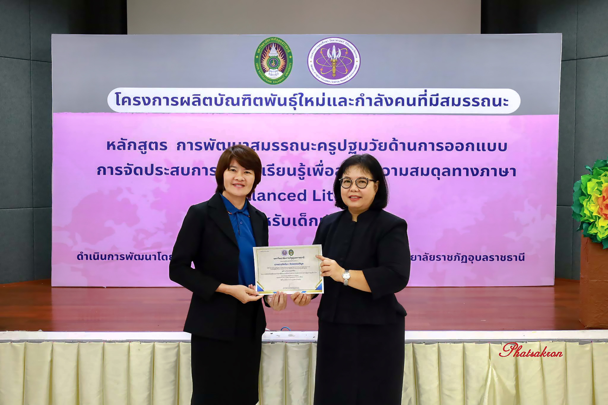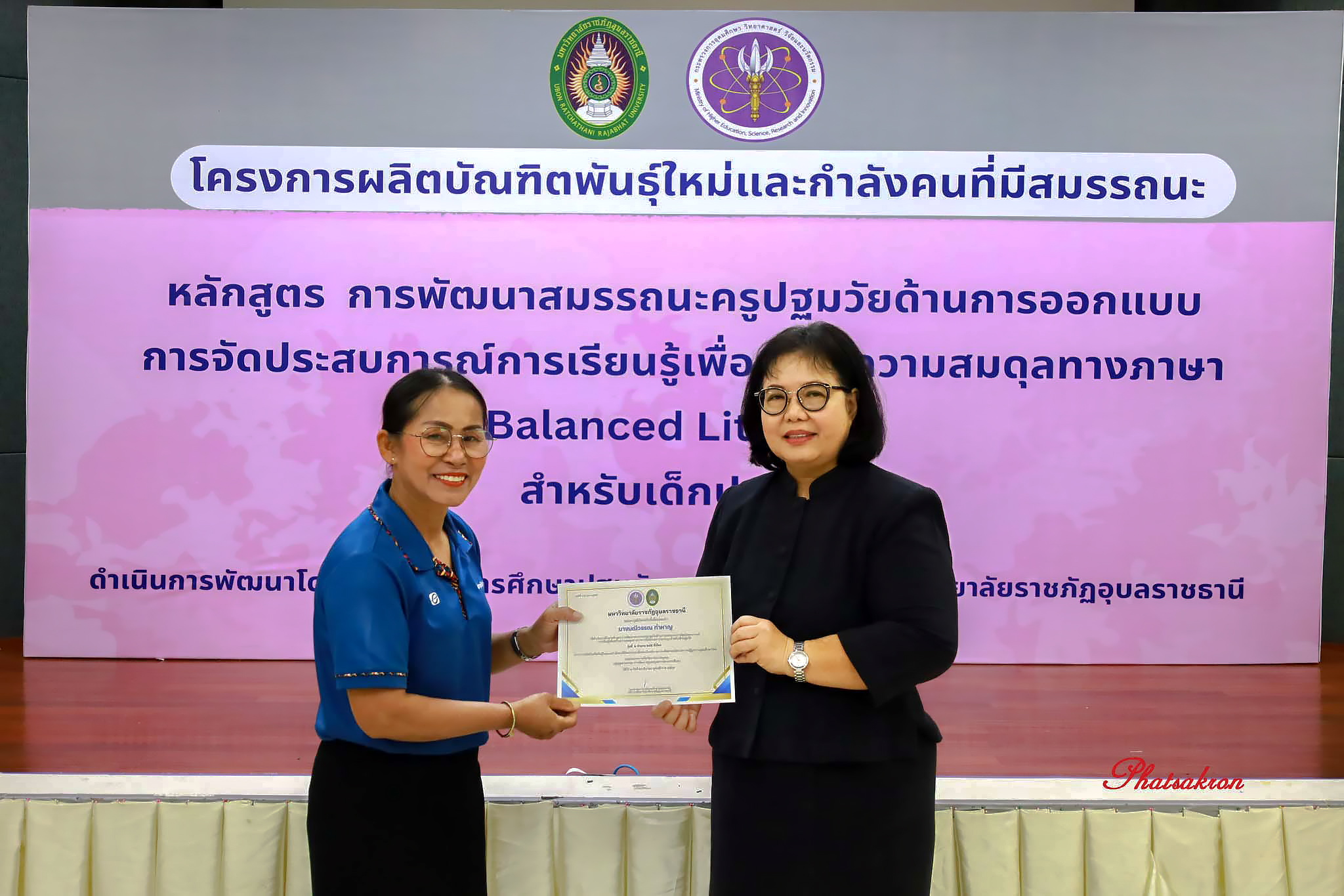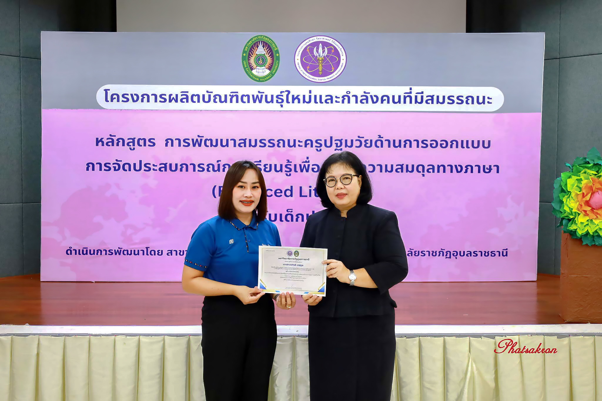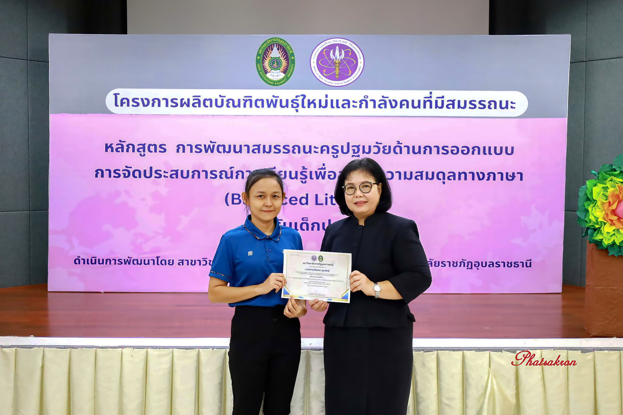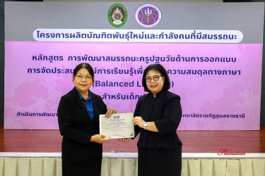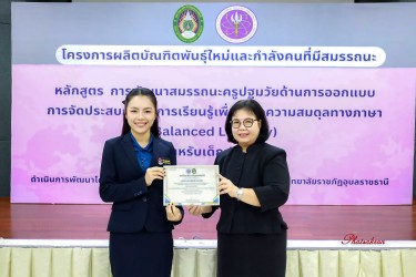 วันที่ 22 มีนาคม 2569 ณ ห้องประชุมสัตตบงกช คณะครุศาสตร์ มหาวิทยาลัยราชภัฏอุบลราชธานี มหาวิทยาลัยราชภัฏอุบลราชธานี จัดพิธีมอบประกาศนียบัตรแก่ผู้ผ่านการอบรมหลักสูตรประกาศนียบัตร (Non-Degree) ภายใต้โครงการผลิตบัณฑิตพันธุ์ใหม่และกำลังคนที่มีสมรรถนะ โดยได้รับเกียรติจาก รองศาสตราจารย์มาลี ไชยเสนา รองอธิการบดี เป็นประธานในพิธีหลักสูตรดังกล่าวคือ “การพัฒนาสมรรถนะครูปฐมวัยด้านการออกแบบและการจัดประสบการณ์การเรียนรู้เพื่อสร้างความสมดุลทางภาษา (Balanced Literacy) สำหรับเด็กปฐมวัย รุ่นที่ 2” ซึ่งมุ่งเน้นการพัฒนาศักยภาพครูให้สามารถออกแบบการเรียนรู้ที่สอดคล้องกับพัฒนาการของเด็กอย่างรอบด้าน ทั้งด้านภาษา ความคิด และทักษะชีวิต