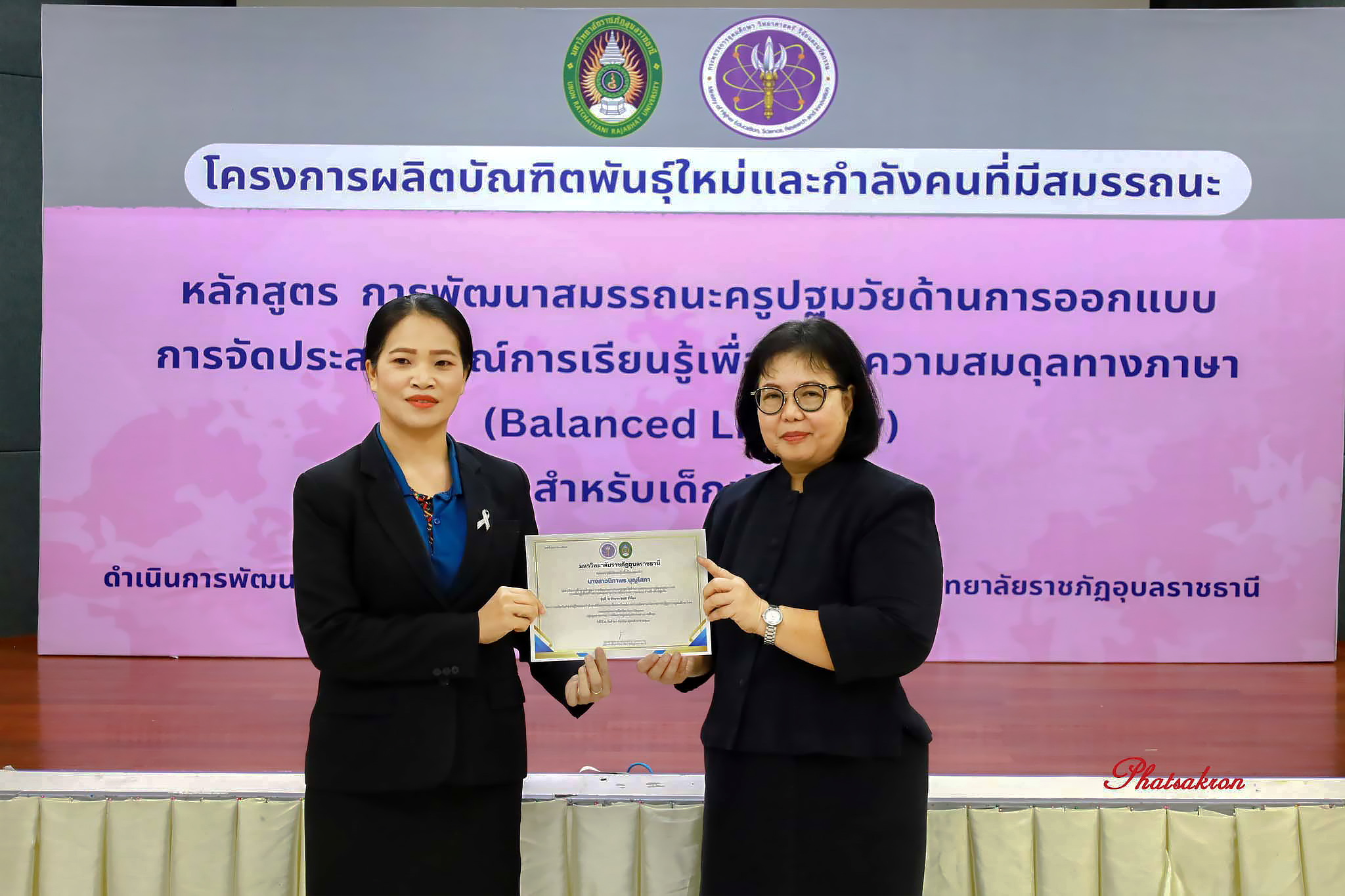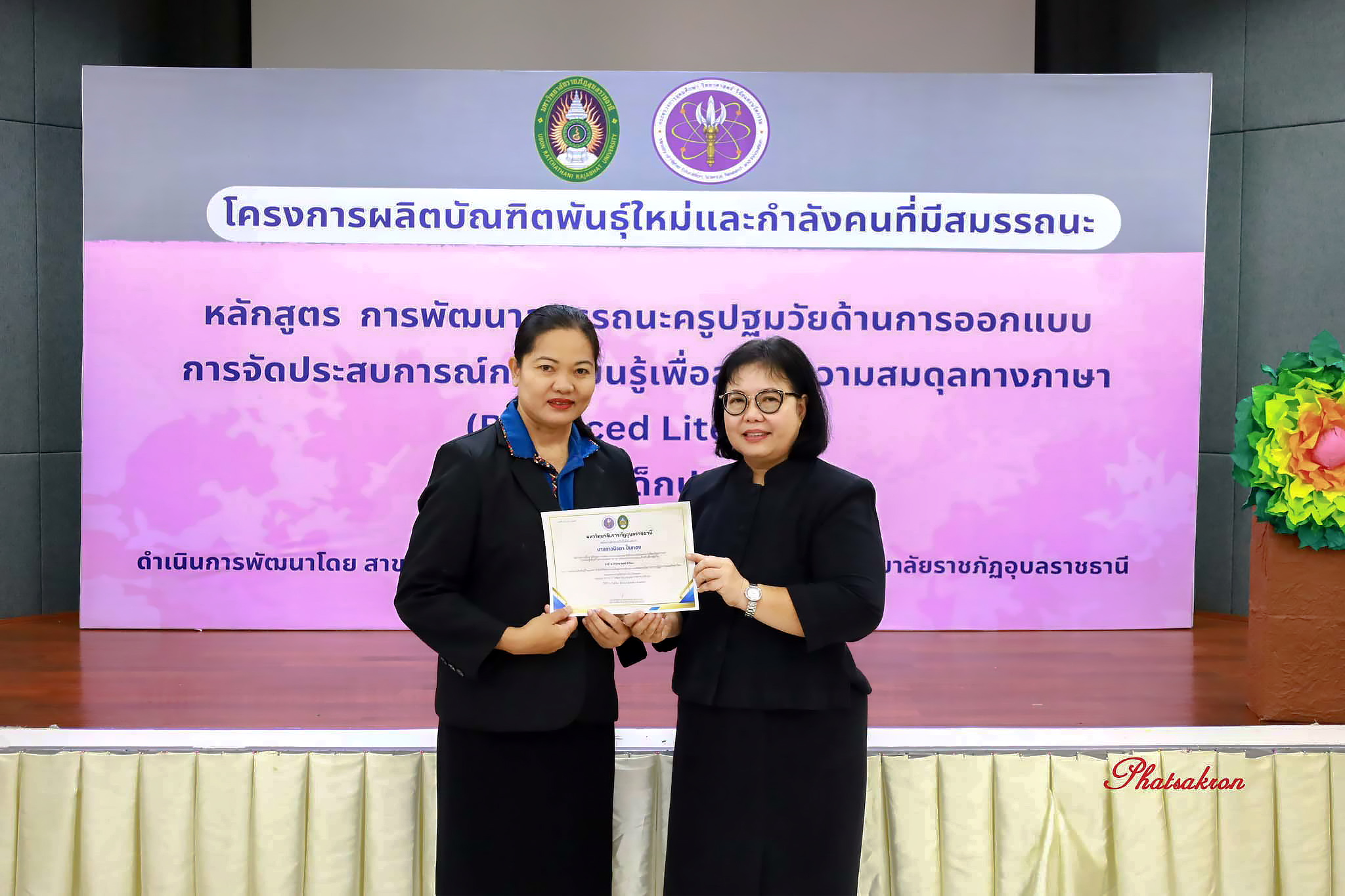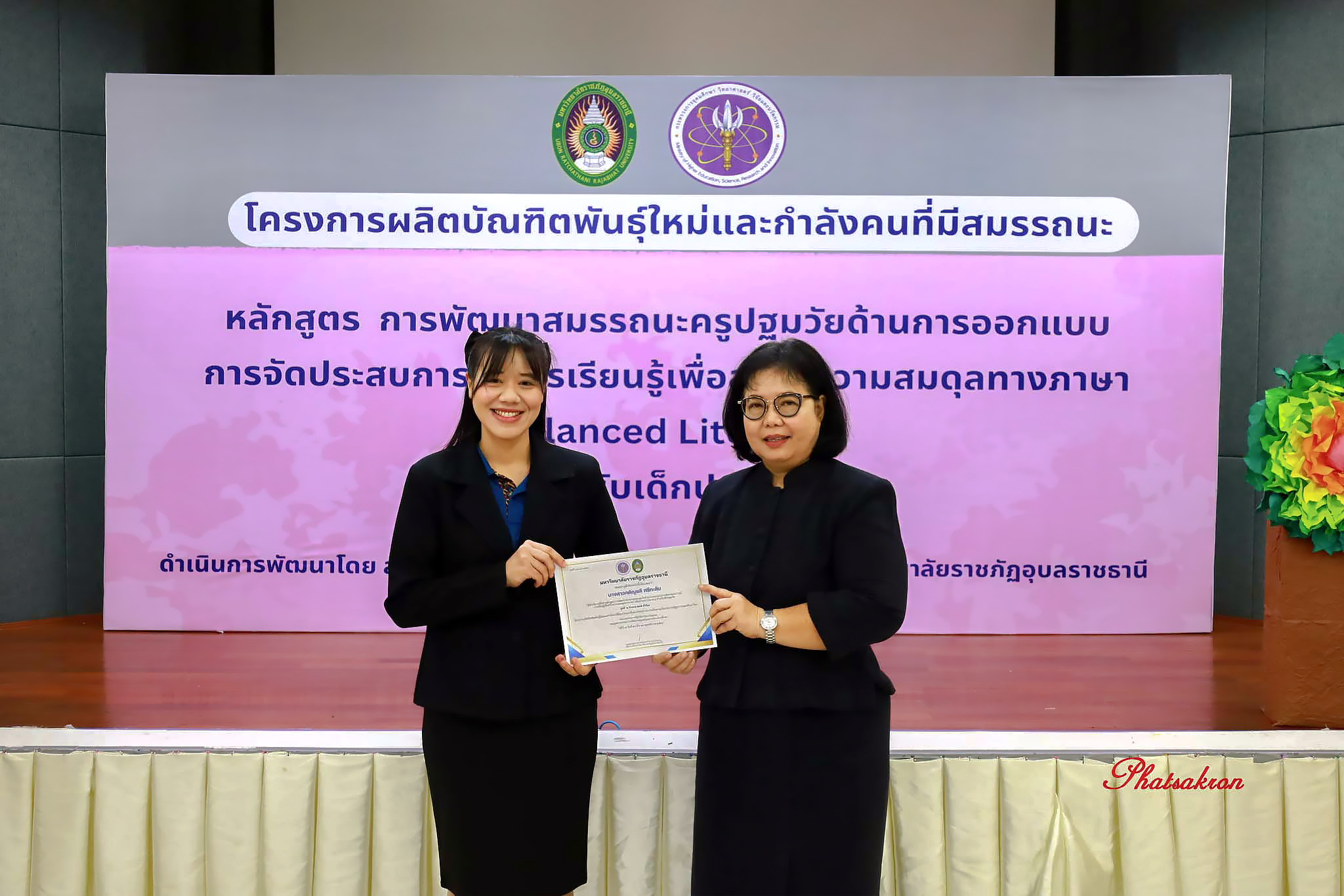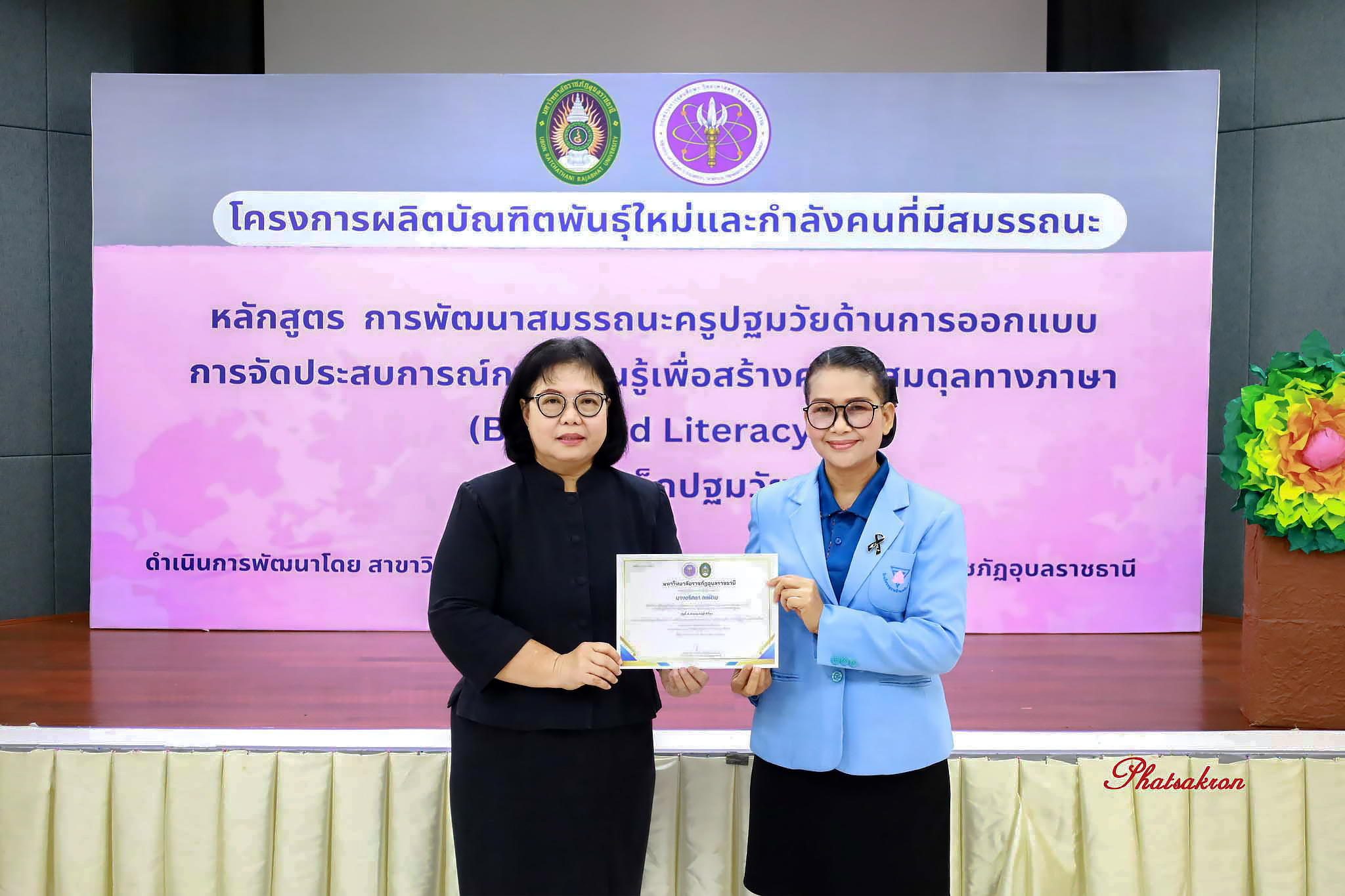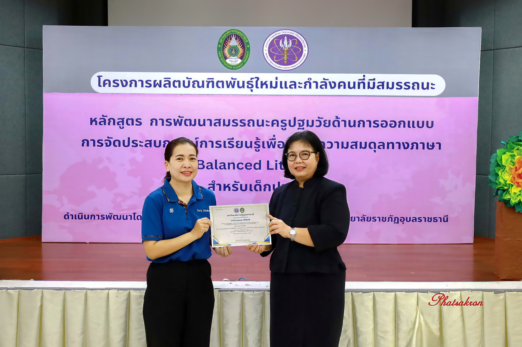 วันที่ 22 มีนาคม 2569 ณ ห้องประชุมสัตตบงกช คณะครุศาสตร์ มหาวิทยาลัยราชภัฏอุบลราชธานี มหาวิทยาลัยราชภัฏอุบลราชธานี จัดพิธีมอบประกาศนียบัตรแก่ผู้ผ่านการอบรมหลักสูตรประกาศนียบัตร (Non-Degree) ภายใต้โครงการผลิตบัณฑิตพันธุ์ใหม่และกำลังคนที่มีสมรรถนะ โดยได้รับเกียรติจาก รองศาสตราจารย์มาลี ไชยเสนา รองอธิการบดี เป็นประธานในพิธีหลักสูตรดังกล่าวคือ “การพัฒนาสมรรถนะครูปฐมวัยด้านการออกแบบและการจัดประสบการณ์การเรียนรู้เพื่อสร้างความสมดุลทางภาษา (Balanced Literacy) สำหรับเด็กปฐมวัย รุ่นที่ 2” ซึ่งมุ่งเน้นการพัฒนาศักยภาพครูให้สามารถออกแบบการเรียนรู้ที่สอดคล้องกับพัฒนาการของเด็กอย่างรอบด้าน ทั้งด้านภาษา ความคิด และทักษะชีวิต
