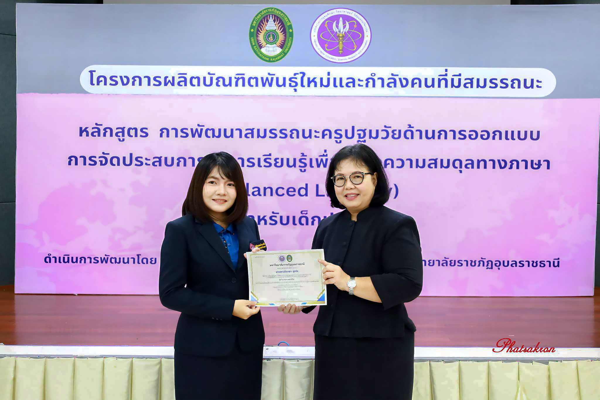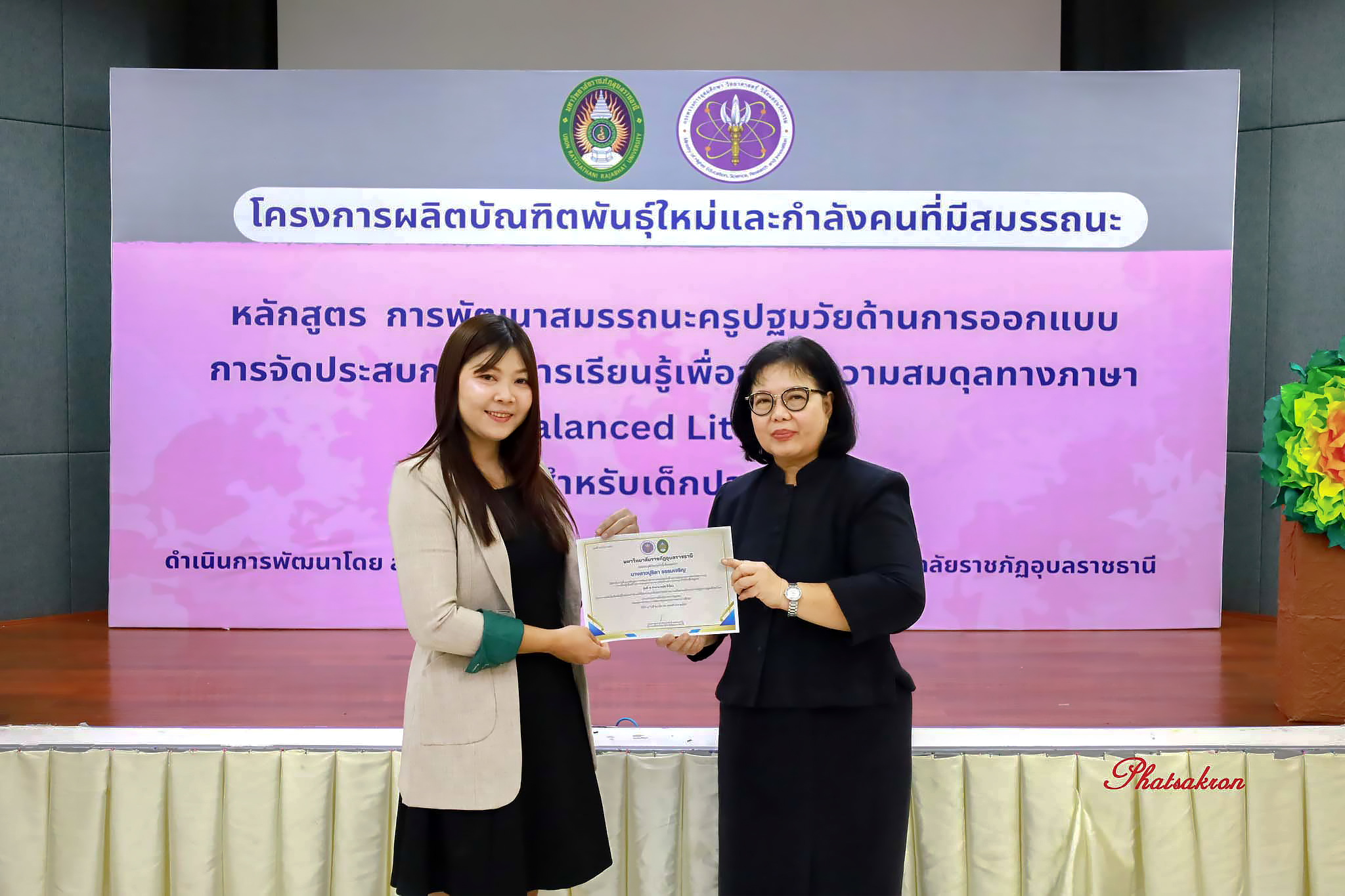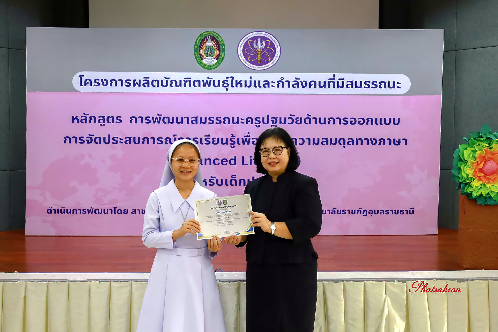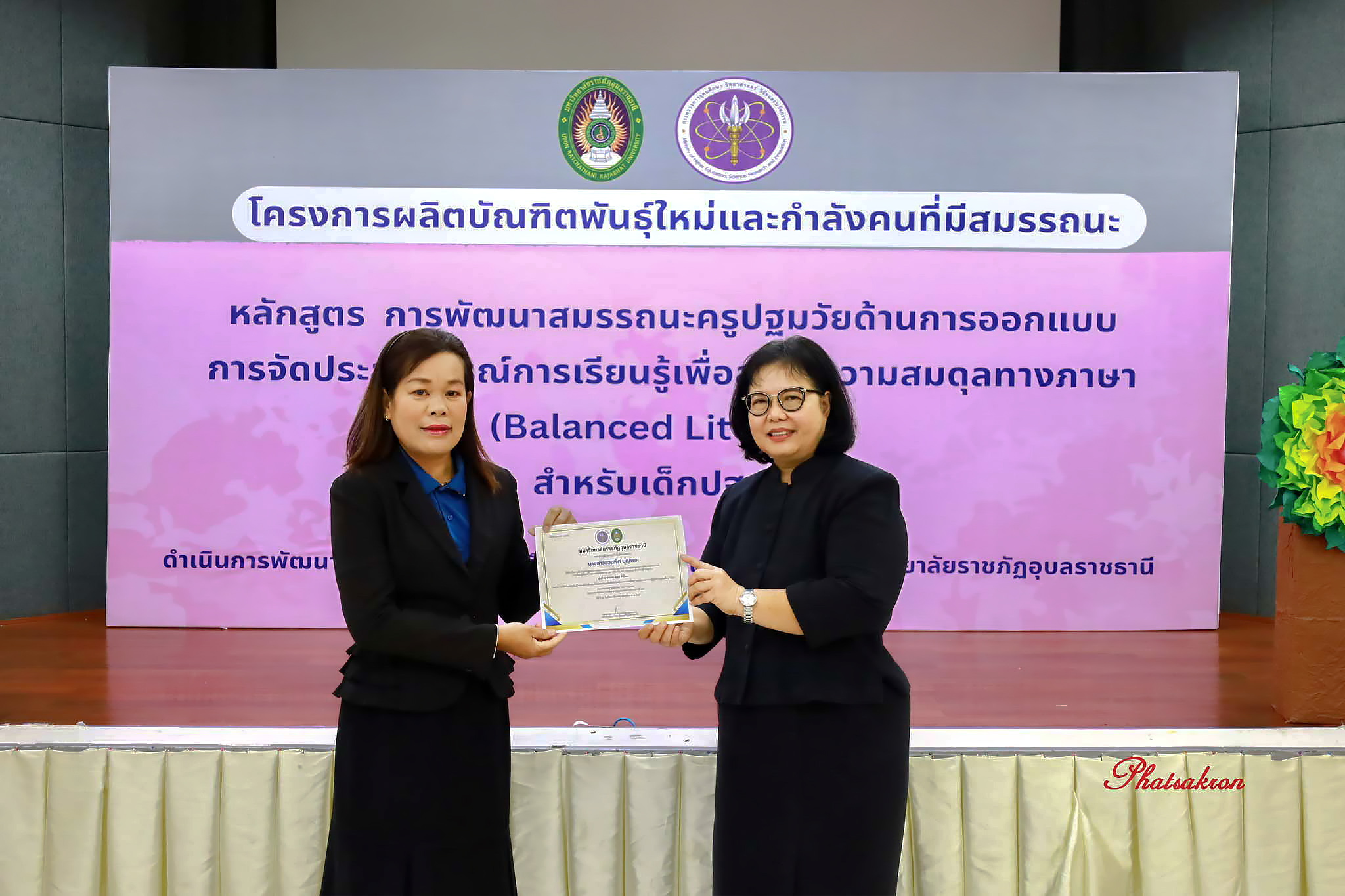 วันที่ 22 มีนาคม 2569 ณ ห้องประชุมสัตตบงกช คณะครุศาสตร์ มหาวิทยาลัยราชภัฏอุบลราชธานี มหาวิทยาลัยราชภัฏอุบลราชธานี จัดพิธีมอบประกาศนียบัตรแก่ผู้ผ่านการอบรมหลักสูตรประกาศนียบัตร (Non-Degree) ภายใต้โครงการผลิตบัณฑิตพันธุ์ใหม่และกำลังคนที่มีสมรรถนะ โดยได้รับเกียรติจาก รองศาสตราจารย์มาลี ไชยเสนา รองอธิการบดี เป็นประธานในพิธีหลักสูตรดังกล่าวคือ “การพัฒนาสมรรถนะครูปฐมวัยด้านการออกแบบและการจัดประสบการณ์การเรียนรู้เพื่อสร้างความสมดุลทางภาษา (Balanced Literacy) สำหรับเด็กปฐมวัย รุ่นที่ 2” ซึ่งมุ่งเน้นการพัฒนาศักยภาพครูให้สามารถออกแบบการเรียนรู้ที่สอดคล้องกับพัฒนาการของเด็กอย่างรอบด้าน ทั้งด้านภาษา ความคิด และทักษะชีวิต