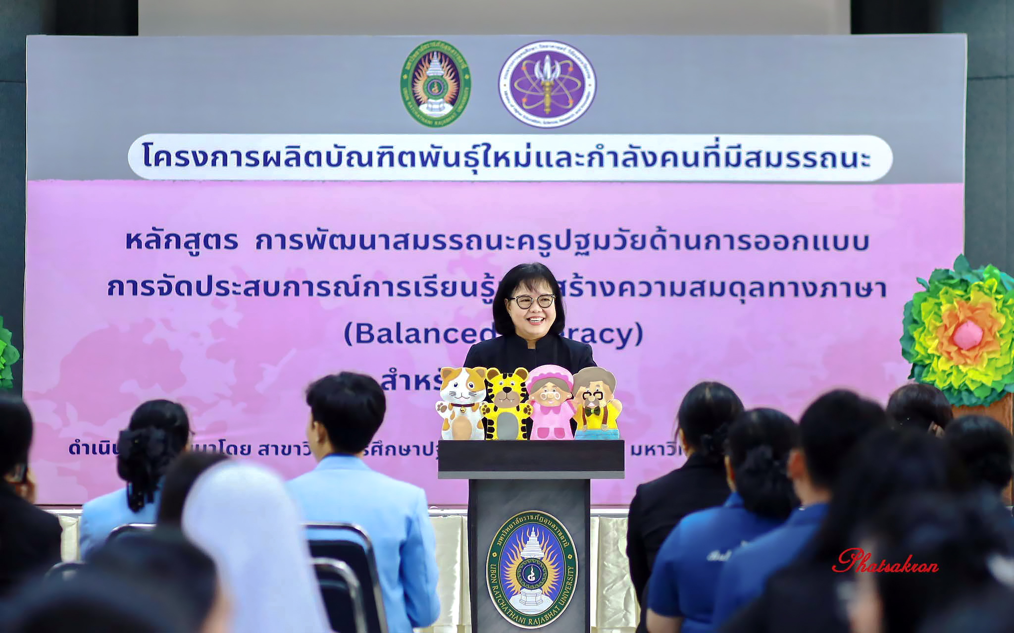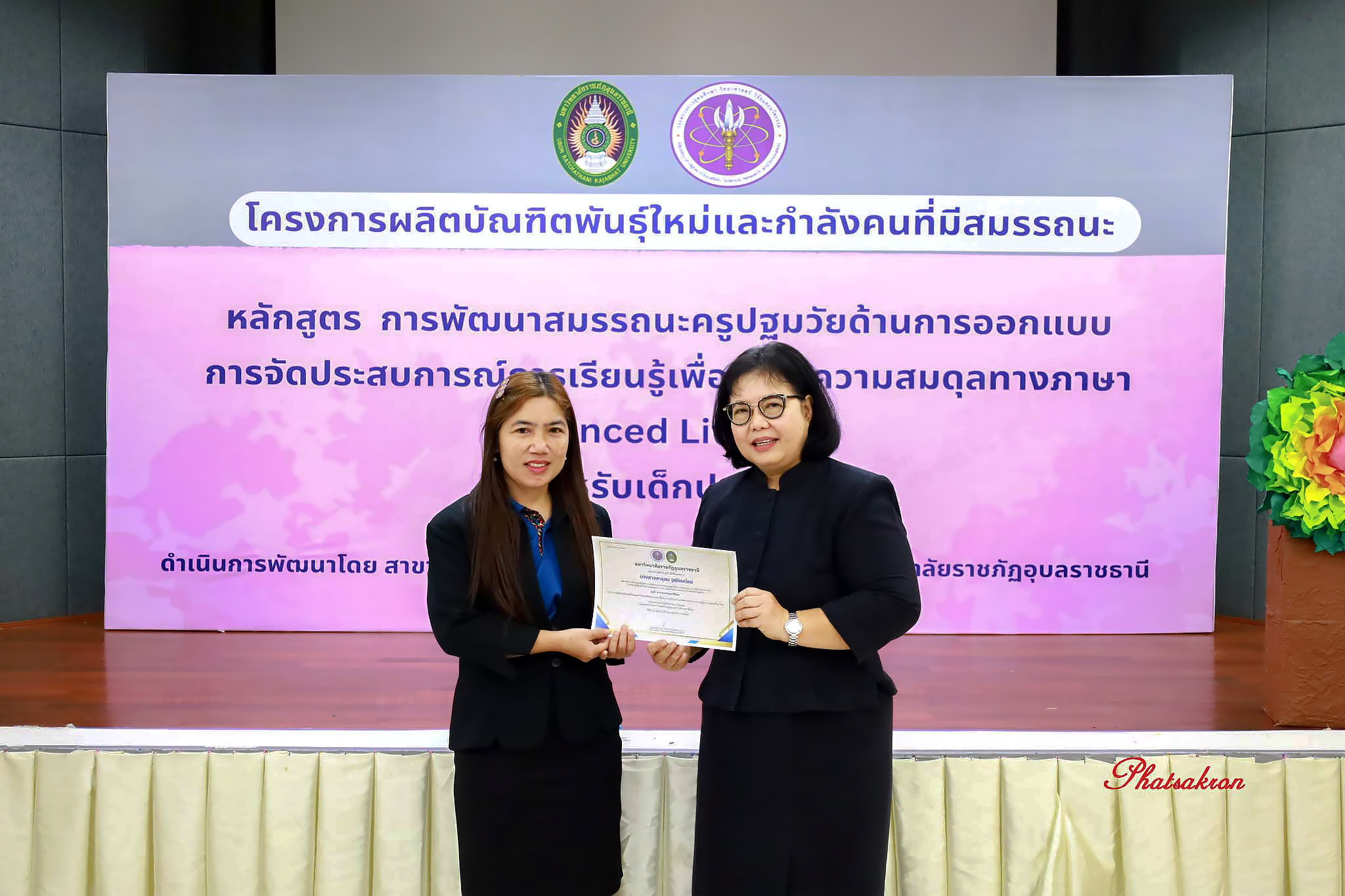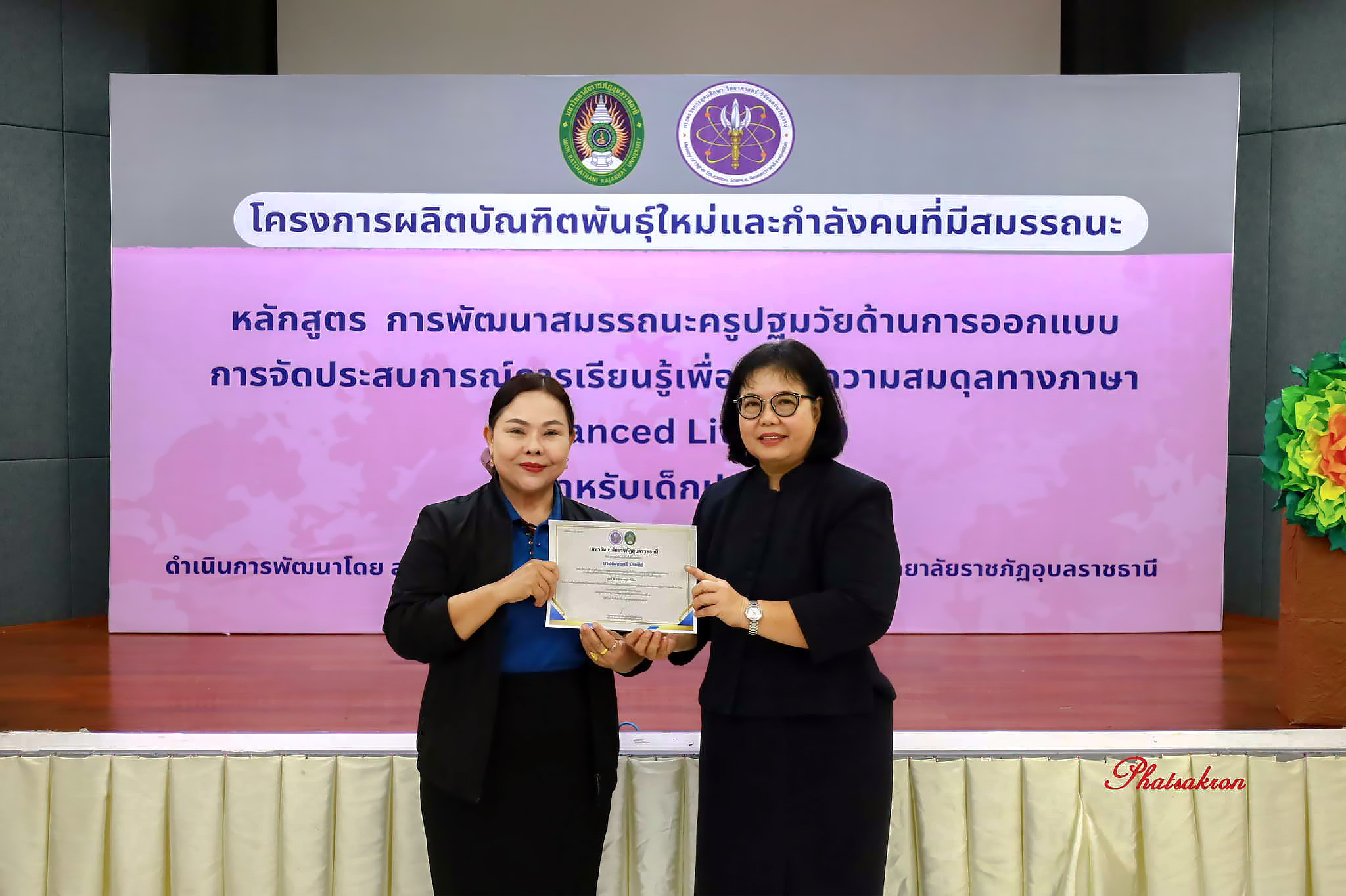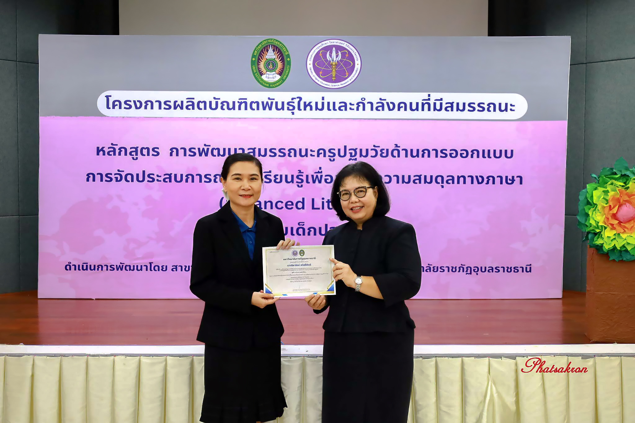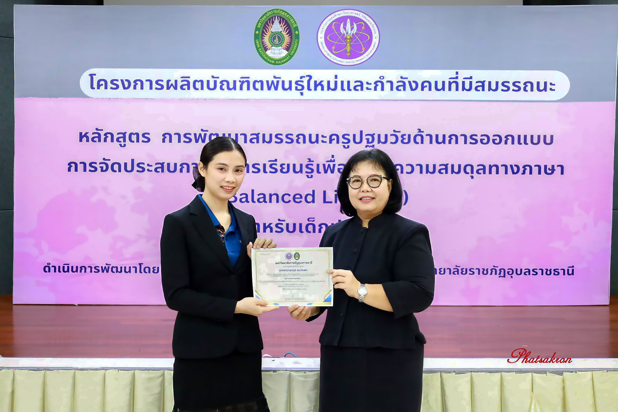 วันที่ 22 มีนาคม 2569 ณ ห้องประชุมสัตตบงกช คณะครุศาสตร์ มหาวิทยาลัยราชภัฏอุบลราชธานี มหาวิทยาลัยราชภัฏอุบลราชธานี จัดพิธีมอบประกาศนียบัตรแก่ผู้ผ่านการอบรมหลักสูตรประกาศนียบัตร (Non-Degree) ภายใต้โครงการผลิตบัณฑิตพันธุ์ใหม่และกำลังคนที่มีสมรรถนะ โดยได้รับเกียรติจาก รองศาสตราจารย์มาลี ไชยเสนา รองอธิการบดี เป็นประธานในพิธีหลักสูตรดังกล่าวคือ “การพัฒนาสมรรถนะครูปฐมวัยด้านการออกแบบและการจัดประสบการณ์การเรียนรู้เพื่อสร้างความสมดุลทางภาษา (Balanced Literacy) สำหรับเด็กปฐมวัย รุ่นที่ 2” ซึ่งมุ่งเน้นการพัฒนาศักยภาพครูให้สามารถออกแบบการเรียนรู้ที่สอดคล้องกับพัฒนาการของเด็กอย่างรอบด้าน ทั้งด้านภาษา ความคิด และทักษะชีวิต
