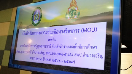บันทึกข้อตกลงความร่วมมือทางวิชาการ ( MOU ) ระหว่าง มหาวิทยาลัยราชภัฏอุบลราชธานีกับสำนักงานเขตพื้นที่การศึกษา สพม.อุบลราชธานี อำนาจเจริญ, สพป.อบ.เขต ๑ – ๕ และ สพป.อำนาจเจริญ ระยะเวลา ๔ ปี ( พ.ศ.๒๕๖๖ – ๒๕๖๙ ) ณ ห้องประชุมโกมุท ชั้น ๔ อาคารเรียนและปฏิบัติการ มหาวิทยาลัยราชภัฏอุบลราชธานี