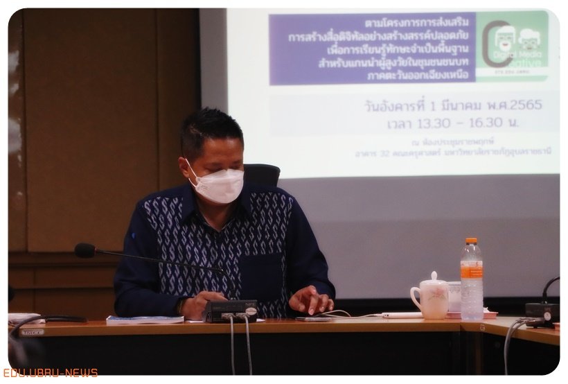 การประชุมสร้างเครือข่ายความร่วมมือระหว่างหน่วยงานพร้อมยกร่างการจัดกิจกรรมพัฒนาทักษะการรู้เท่าทันสื่อดิจิทัลและการพัฒนาทักษะการผลิตสื่อสร้างสรรค์ปลอดภัย สำหรับผู้สูงอายุแกนนำในชุมชนชนบท ณ ห้องประชุมราชพฤกษ์ ชั้น 32.401 คณะครุศาสตร์ มหาวิทยาลัยราชภัฏอุบลราชธานี วันอังคารที่ 1 มีนาคม 2565