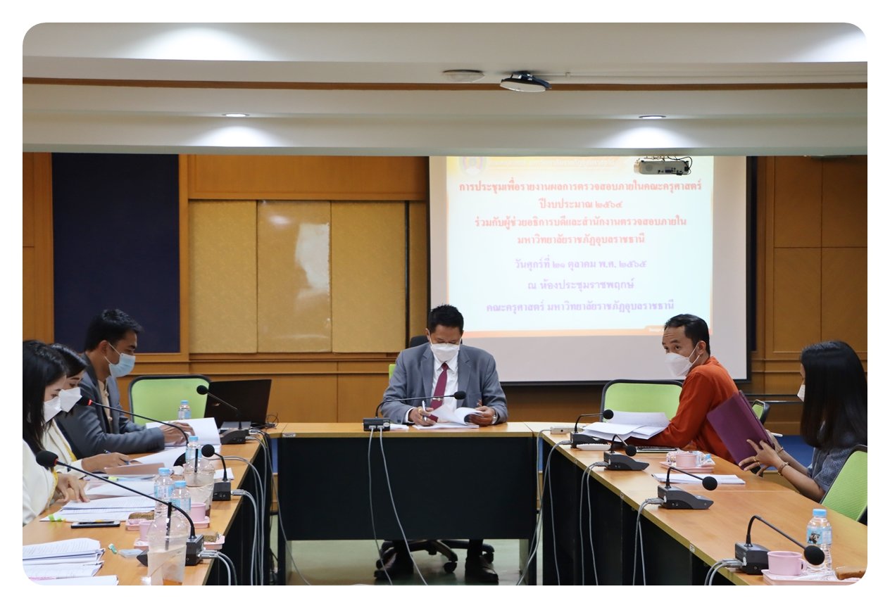 การประชุมเพื่อรายงานผลการตรวจสอบภายในคณะครุศาสตร์ ปีงบประมาณ 2564ร่วมกับผู้ช่วยอธิการบดีและสำนักงานตรวจสอบภายใน มหาวิทยาลัยราชภัฏอุบลราชธานี ณ ห้องประชุมราชพฤกษ์ ชั้น 4 คณะครุศาสตร์ มหาวิทยาลัยราชภัฏอุบลราชธานี วันศุกร์ที่ 21 มกราคม 2565