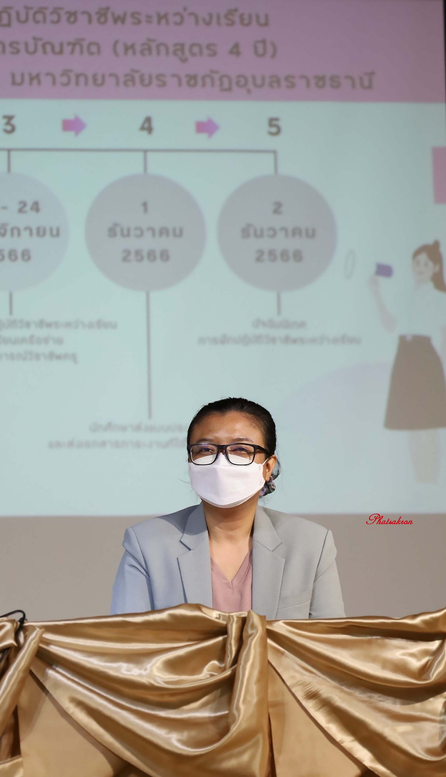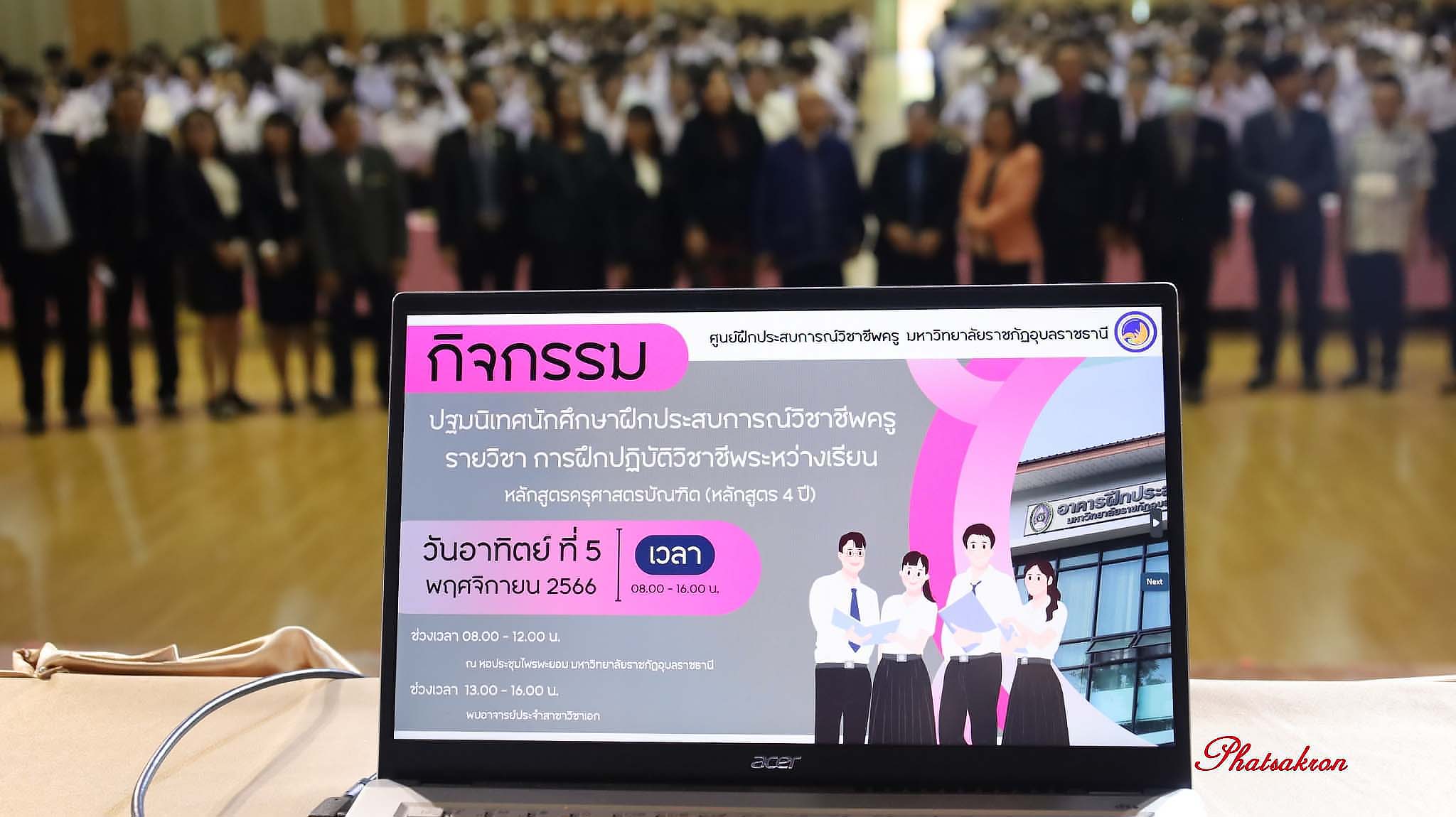 วันนี้ ๕ พฤศจิกายน พ.ศ.๒๕๖๖ ที่หอประชุมไพรพะยอม มหาวิทยาลัยราชภัฏอุบลราชธานี รศ.ธรรมรักษ์ ละอองนวล รักษาราชการแทนอธิการบดี มอบหมายให้ รศ.ดร.มาลี ไชยเสนา รองอธิการบดี เป็นผู้แทนอธิการบดีฯ เป็นประธานฯ เปิดกิจกรรม ปฐมนิเทศนักศึกษาฝึกประสบการณ์วิชาชีพครู รายวิชา การฝึกปฏิบัติวิชาชีพระหว่างเรียน หลักสูตรครุศาสตรบัณฑิต ( หลักสูตร ๔ ปี ) วันอาทิตย์ที่ ๕ พฤศจิกายน พ.ศ.๒๕๖๖ เวลา o๘.oo – ๑๖.oo น. ณ หอประชุมไพรพะยอม มหาวิทยาลัยราชภัฏอุบลราชธานี