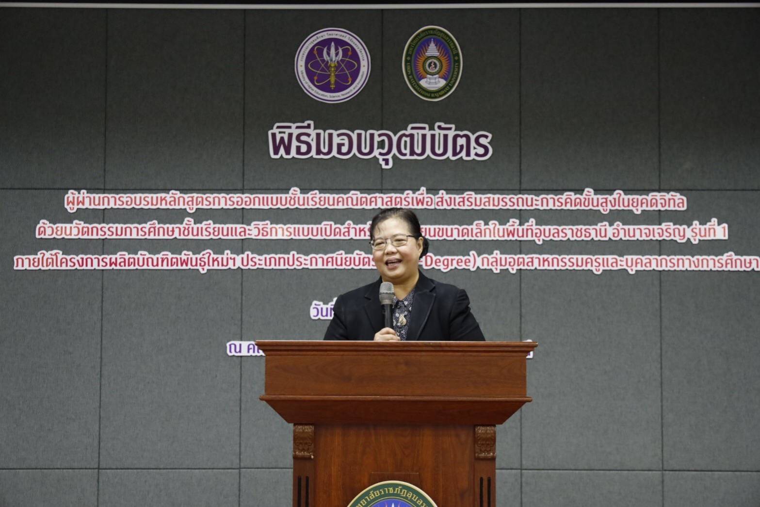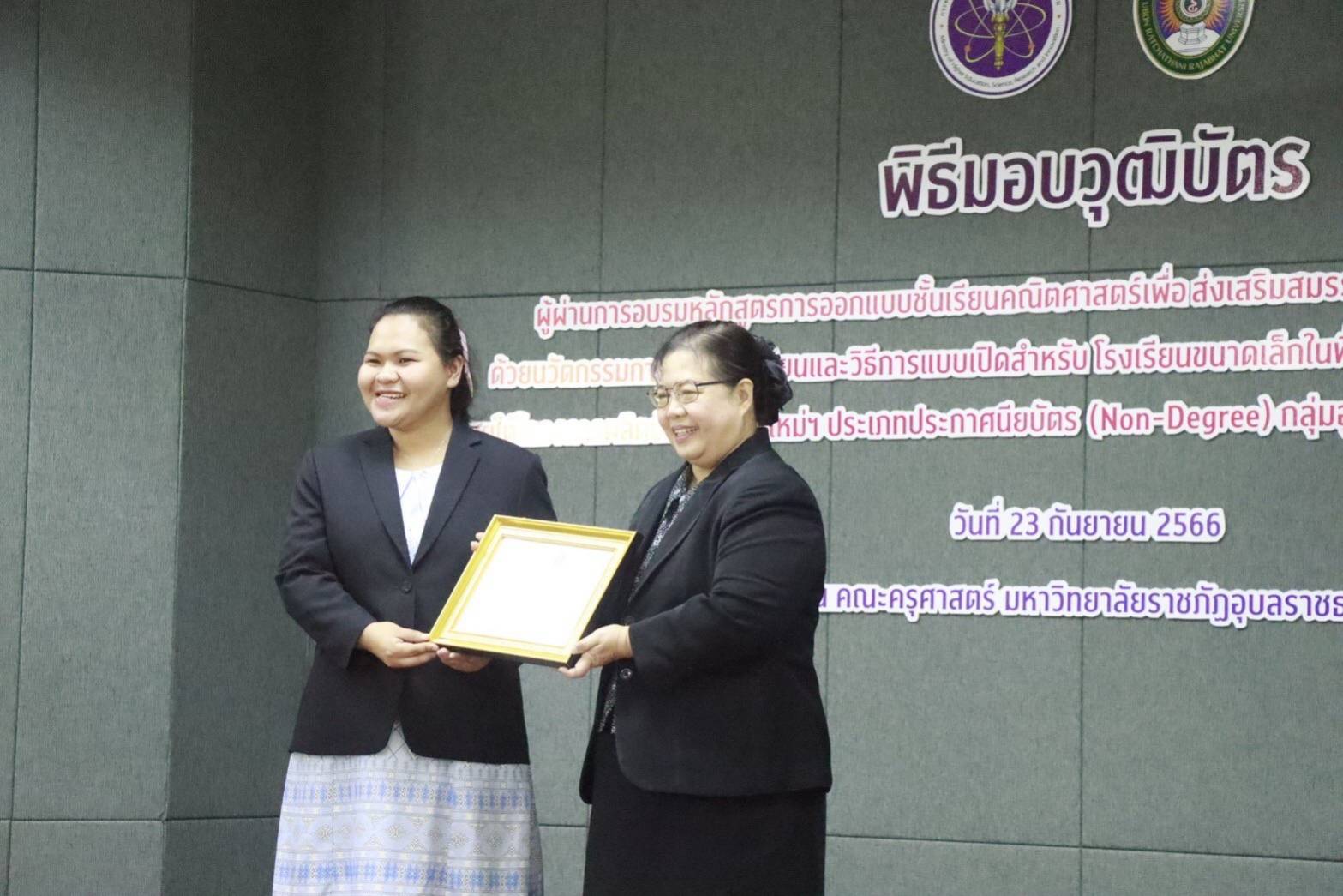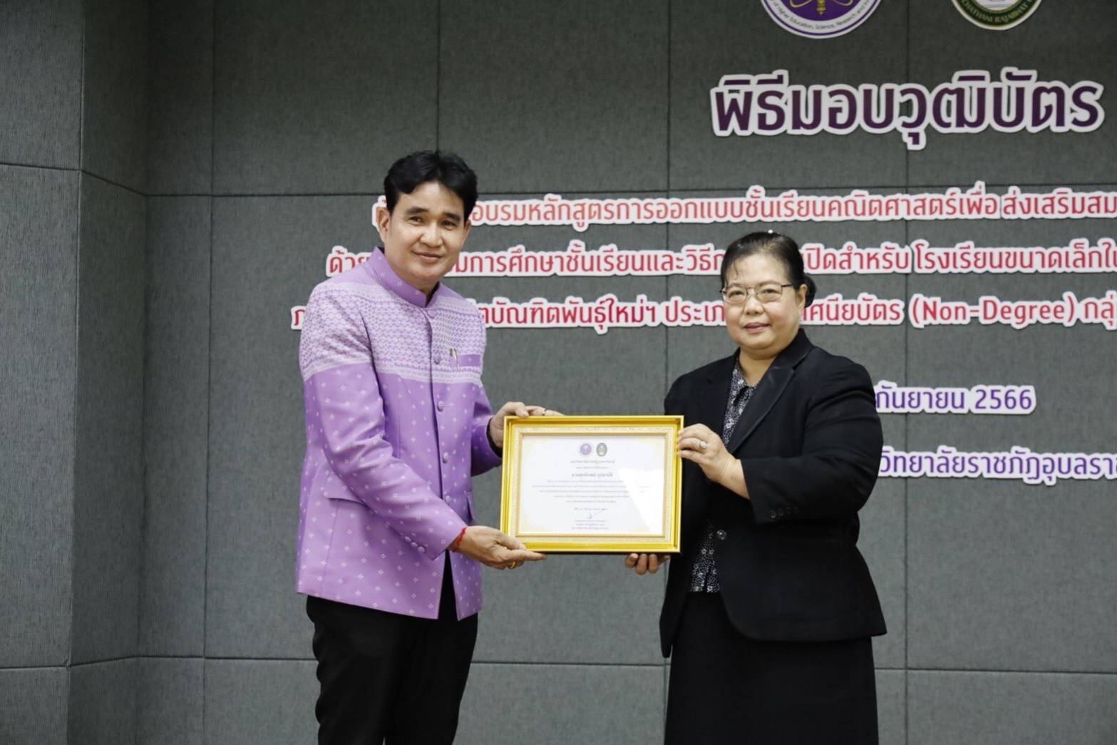 23 ก.ย. 66 รองศาสตราจารย์ดร.มาลี ไชยเสนา รองอธิการบดีฝ่ายวิชาการ มหาวิทยาลัยราชภัฏอุบลราชธานี ได้ให้เกียรติเป็นประธานพิธีมอบวุฒิบัตรผู้ผ่านการอบรมหลักสูตรการออกแบบชั้นเรียนคณิตศาสตร์เพื่อส่งเสริมสมรรถนะการคิดขั้นสูงในยุคดิจิทัลด้วยนวัตกรรมการศึกษาชั้นเรียนและวิธีการออกแบบเปิดสำหรับโรงเรียนขนาดเล็กในพื้นที่อุบลราชธานี อำนาจเจริญ รุ่นที่1 ภายใต้โครงการผลิตบัณฑิตพันธุ์ใหม่ ประเภทประกาศนียบัตร (Non-Degree) กลุ่มอุตสาหกรรมครูและบุคลากรทางการศึกษา
