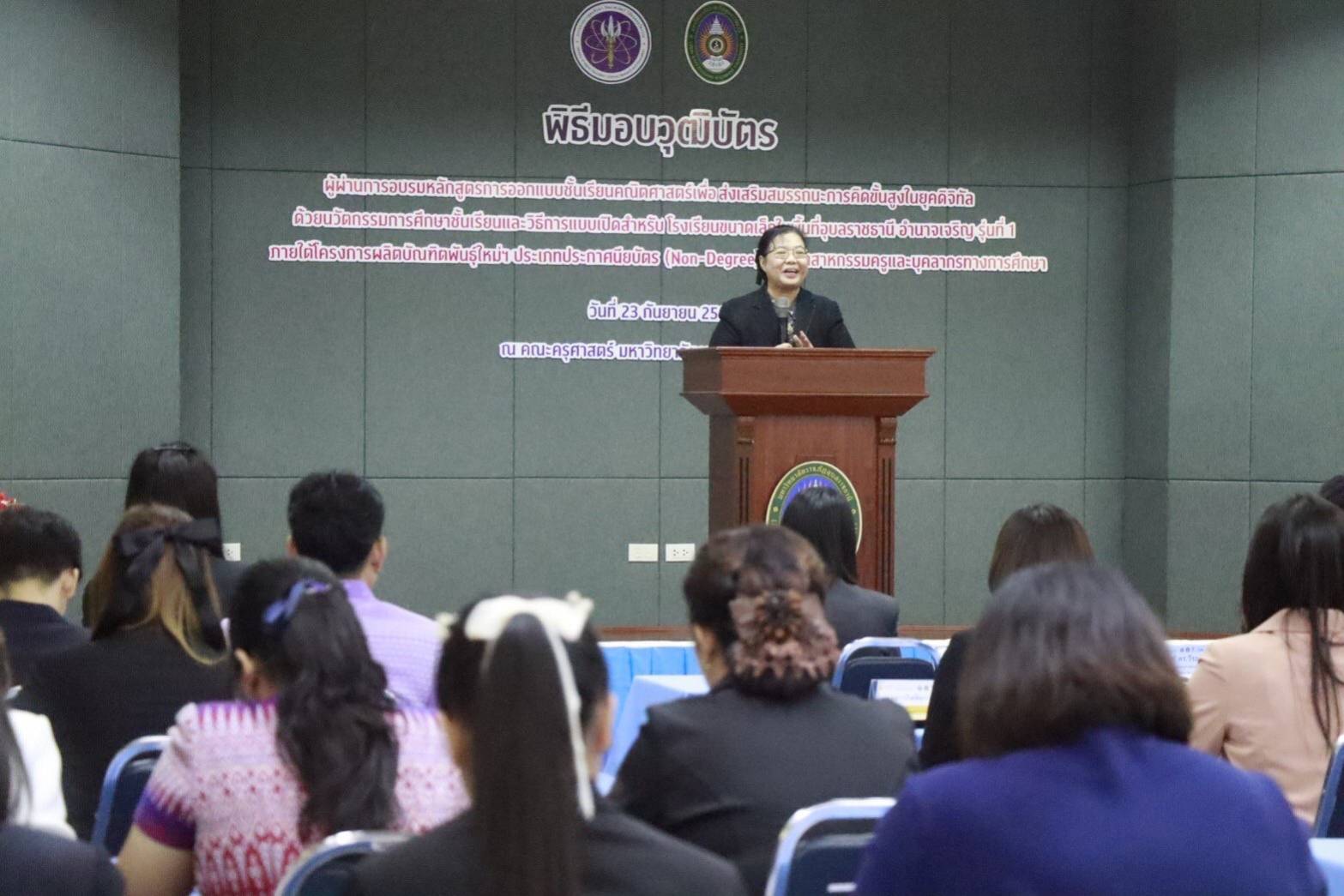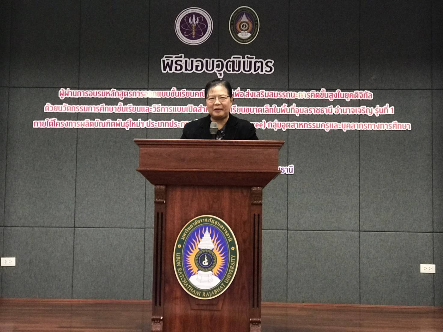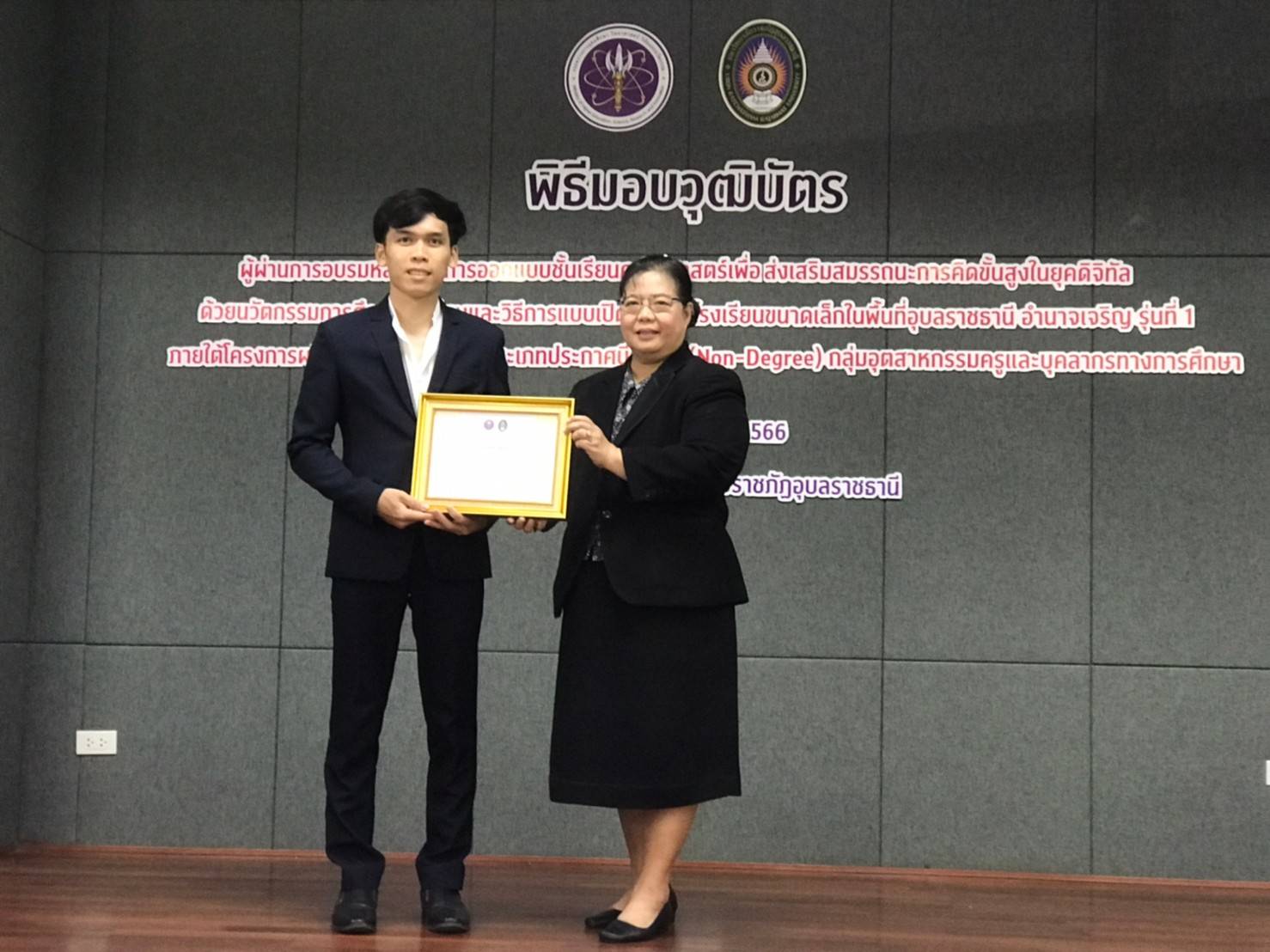 23 ก.ย. 66 รองศาสตราจารย์ดร.มาลี ไชยเสนา รองอธิการบดีฝ่ายวิชาการ มหาวิทยาลัยราชภัฏอุบลราชธานี ได้ให้เกียรติเป็นประธานพิธีมอบวุฒิบัตรผู้ผ่านการอบรมหลักสูตรการออกแบบชั้นเรียนคณิตศาสตร์เพื่อส่งเสริมสมรรถนะการคิดขั้นสูงในยุคดิจิทัลด้วยนวัตกรรมการศึกษาชั้นเรียนและวิธีการออกแบบเปิดสำหรับโรงเรียนขนาดเล็กในพื้นที่อุบลราชธานี อำนาจเจริญ รุ่นที่1 ภายใต้โครงการผลิตบัณฑิตพันธุ์ใหม่ ประเภทประกาศนียบัตร (Non-Degree) กลุ่มอุตสาหกรรมครูและบุคลากรทางการศึกษา