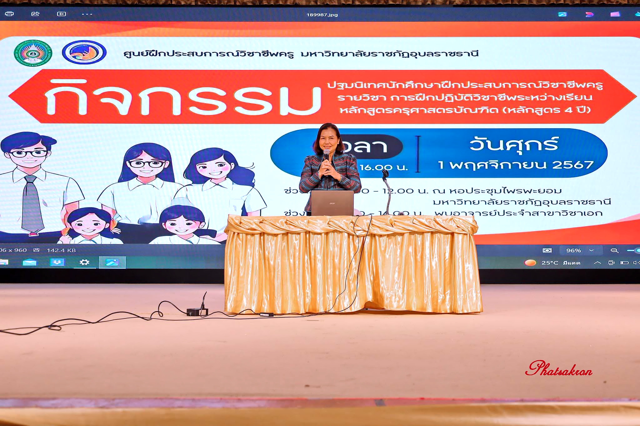 วันที่ 1 พฤศจิกายน 2567 เวลา 09.00 น. ผู้ช่วยศาสตราจารย์วรางคณา วุฒิช่วย รองอธิการบดี มหาวิทยาลัยราชภัฏอุบลราชธานีได้กล่าวเปิดกิจกรรมการปฐมนิเทศก่อนการฝึกประสบการณ์วิชาชีพครู รายวิชา การฝึกปฏิบัติวิชาชีพระหว่างเรียน หลักสูตรครุศาสตรบัณฑิต (หลักสูตร 4 ปี ) ณ หอประชุมไพรพะยอม มหาวิทยาลัยราชภัฏอุบลราชธานี